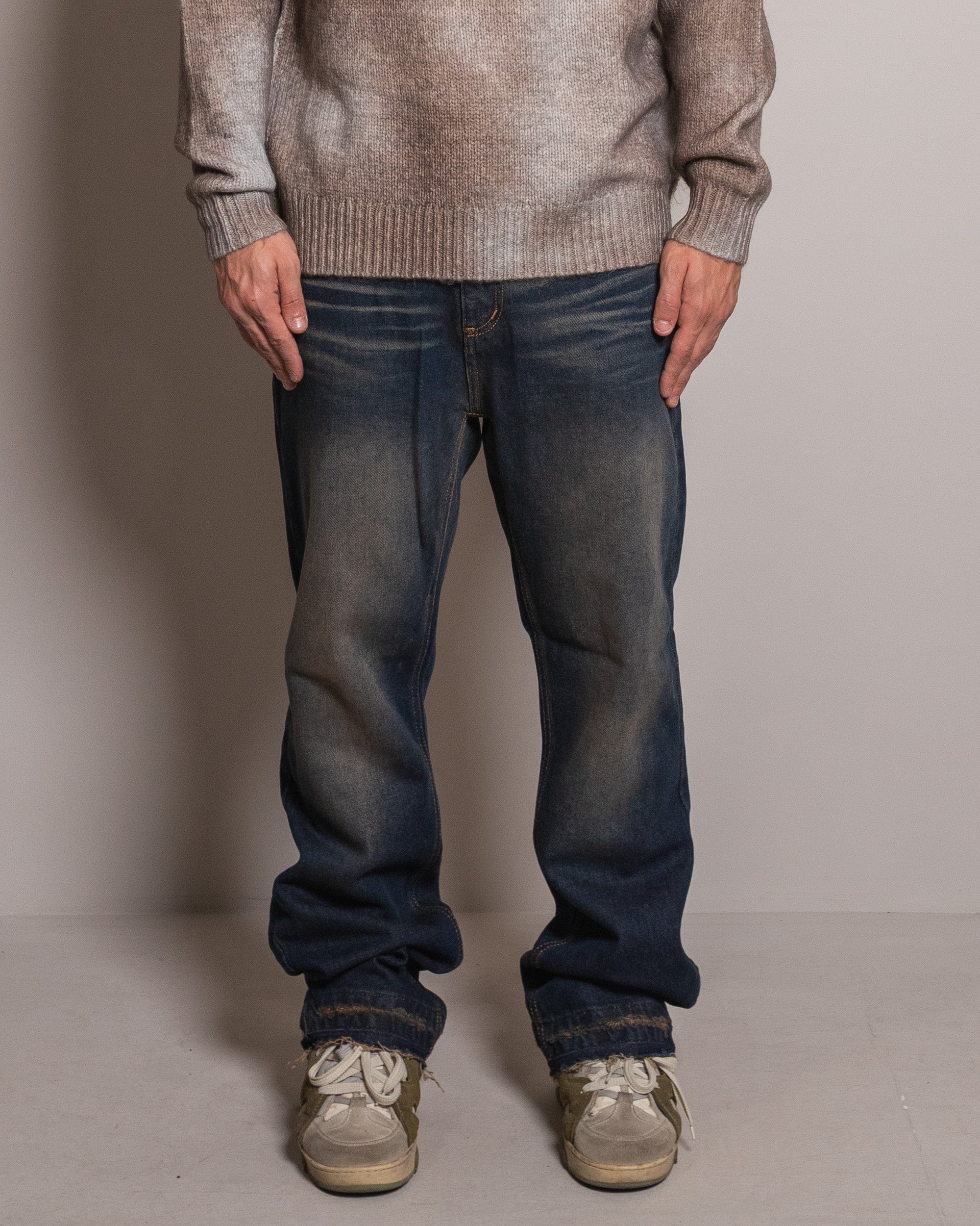 Il jeans sabbiato scuro flare fit è disponibile dalla 42 alla 52.